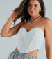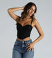 Everyone will be totally smitten with you in this lace bustier! The top is designed with a flattering sweetheart neckline. detachable and adjustable spaghetti straps. a built-in padded underwire bust. flexible boning inserts. a cropped hem. and multiple back hook and eye closures on lace-lined fabric. Complete the look in high-rise jeans for a brunch or day party!