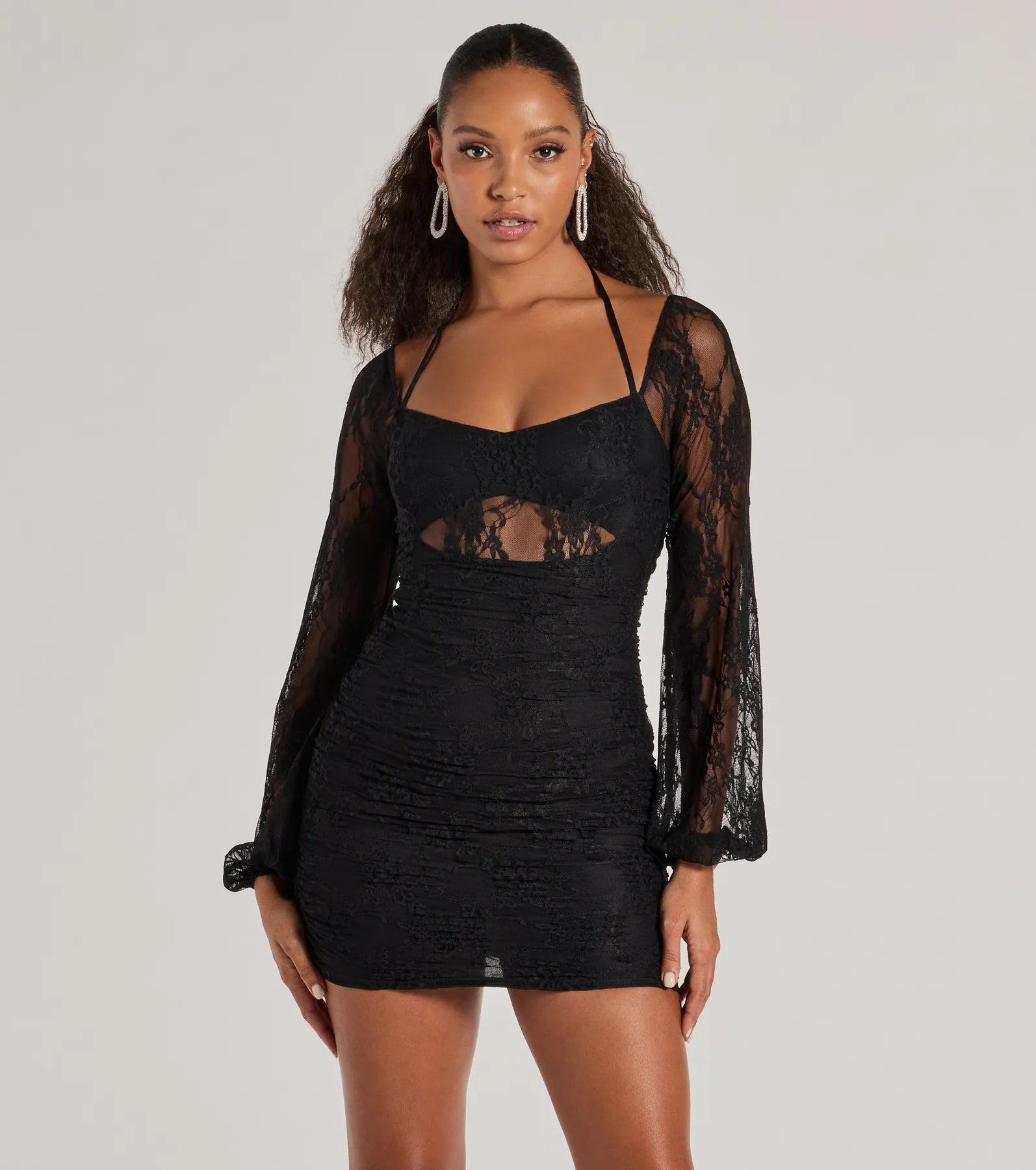 This alluring lace mini dress features a V-neckline. halter spaghetti straps with a tie-back design. sheer long balloon sleeves. and a sheer insert under the bust for a chic look. The short ruched bodycon silhouette will showcase your stunning curves.