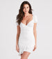 You'll look oh-so-darling in this crepe short dress for graduation ceremonies or bridal showers! The dress features adorable puff short sleeves. a surplice V-neckline with pleating. a bodycon silhouette. and a ruffled wrap hem. Complete the look in strappy mules.