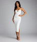 Discover your new signature look with this irresistible midi dress featuring a unique shell accent neckline.  lace-up back offers undeniable allure. and a sultry side slit creates movement.