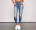 Step out in these stylish jeans to take you from day to night! The jeans feature a high-rise waist. a multi-button down front. a traditional five-pocket with belt loop design. moderate distressing. and a cropped raw edge hem. Complete the look with a graphic tee and sneakers.Â