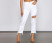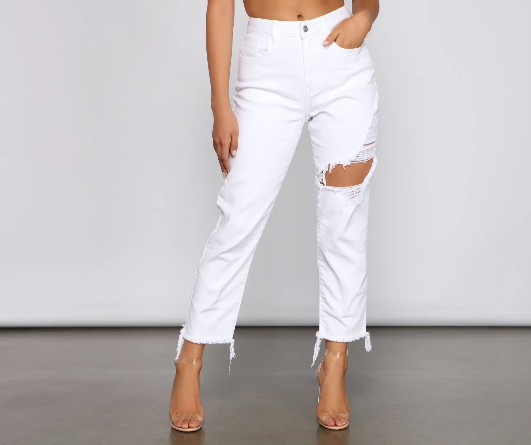 Refresh your wardrobe with this trendy pair of destructed mom jeans. They feature a high-rise waist. a traditional five-pocket and belt loop design. a front button closure. destructed detailing. a frayed hem. and a relaxed mom jean fit. Style this pair of denim with clear heels.