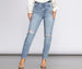 We love a good distressed pair of denim! These high rise boyfriend jeans feature the traditional five pocket and belt loop design. a front button and hidden zipper closure. slight destructed detailing down the leg. and a tapered leg fit. The jeans offer moderate stretch.