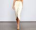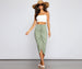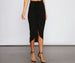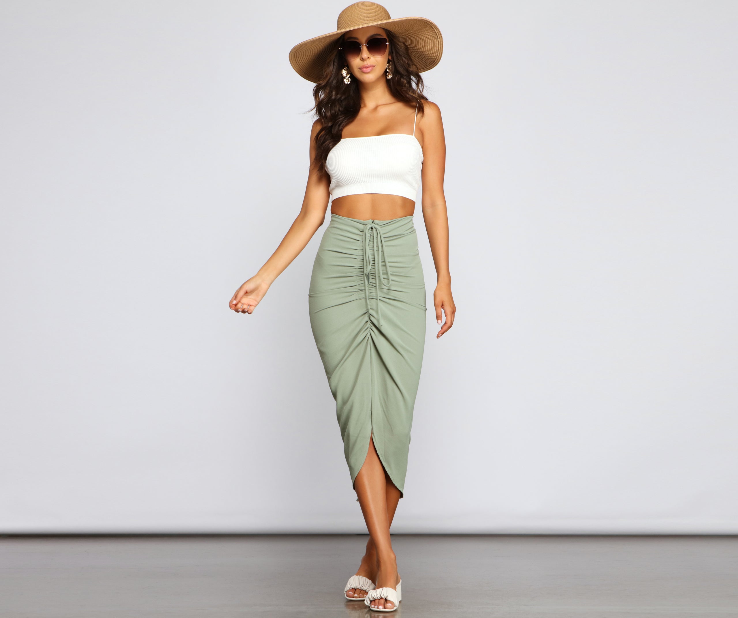 Bring the drama with a skirt that elevates your outfits from day to night! The skirt features a high-rise waist. a ruched body with a drawstring. a hidden front zipper. a high center slit. and a midi-length silhouette. The skirt is composed of a lightweight woven fabric that offers a form-hugging fit with minimal stretch. Complete look with a blouse and mules.