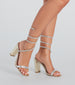 These statement block heels are the perfect combination of elegance and allure! Featuring a square toe. rhinestone-embellished chevron pattern toe strap. and a spiral ankle strap with more rhinestone embellishments. this block heel will make you sparkle! Complete the look in fringe earrings for a gala dinner or school dance!