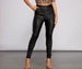 These coated faux leather skinny pants will give your girl's night out look an edgy vibe! They feature a high-rise waist. a front zipper and hidden-button closure. front pockets. seam detailing. and a form-hugging. slim fit. The faux leather fabric offers a moderate stretch for comfortable wear. Complete your outfit with an embellished bustier and heels.