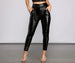 Make it edgy and glam with these trendy pants! These must-have pants feature a high-rise paper bag waist with a tie-waist belt. slant pockets. and a skinny straight leg. The pants are composed of a faux leather fabric that offers a form-hugging fit with a moderate stretch. Complete the look with a rhinestone bustier to create a glam date night outfit.