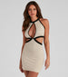 This sleeveless sweater dress brings sultry-sophistication to every occasion! It features a halter neckline. side cutouts on the bodice. and a form-fitting silhouette on a mini-length hem. Complete the look in a classy blazer and heels.