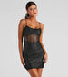Hit the lights and let the music move you in this glitter mesh mini dress perfect for your next club night! It features a sleeveless. scoop neckline with spaghetti straps. a ruched bust. a sheer bodice with piped trim. and a short. form-hugging fit. Complete the look in chic lace-up heels.