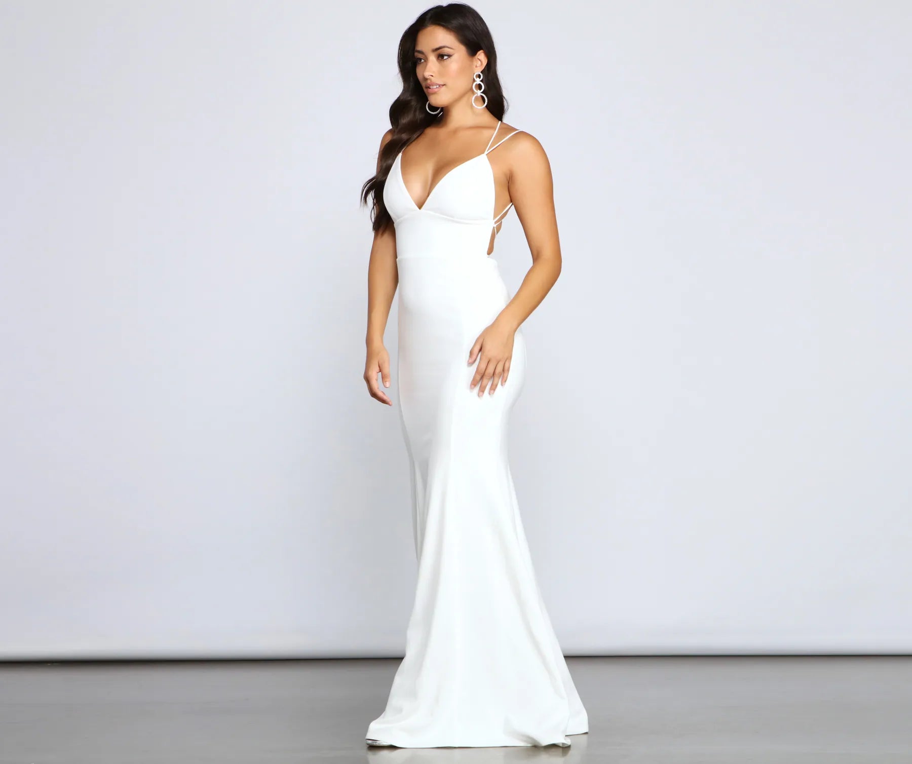 Showcase a chic and sexy vibe in the stunning Holly mermaid dress. She features a sleeveless deep V-neckline. dual spaghetti straps that lead to a cross-back lace-up design. a high waist seam. and a curve-hugging fit with a floor-length mermaid silhouette. Style this dress with rhinestone earrings to add some glamour and a pair of strappy stilettos.