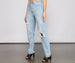 Slay like the icon you are with these jeans that are a staple piece for your everyday looks! The jeans feature a high-rise waist. a single button with zipper closure. a traditional five-pocket with belt lop design. moderate destruction. and a relaxed straight leg. Complete look with a tie-front top and sneakers.