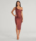 Show off an iconic silhouette and flaunt your stunning curves in this midi dress designed with sleek and smooth knit fabric. It features an asymmetric off-shoulder neckline with a draped cowl design at the bust. ruched detailing. and a high-cut side slit.