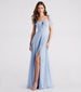 The Idina formal dress delivers all the romance for bridesmaids. wedding guests. or dressy family parties! She features adorable puff short sleeves. a square neck. a ruched bust with a flirty tie. and a flowy silhouette that creates the wrap-style high slit along her floor-length hem. The formal dress is composed of airy chiffon fabric with a stretchy knit lining. Complete the look in a statement necklace and earrings set.