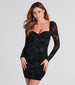 This mini dress is in bloom for the holiday season! It features sheer fitted long sleeves. a sweetheart neckline with a padded bust. a front ruched seam for added flair. and a bodycon silhouette. The dress is designed with a romantic velvet floral burnout pattern on mesh fabric with a stretchy knit lining. Complete the look with earrings for a holiday dinner or party!