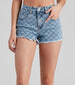 Keep your look in check wearing these eye-catching denim mom shorts! They feature a classic high-rise waist. and a checkered pattern on a medium wash denim fabric with a frayed hem. Complete the look in a tie-front top and sneakers.