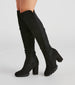 Take charge of your edgy style in these over-the-knee boots featuring an almond toe. block heel. lug sole. and a 50/50 faux suede and knit material panel. Style with an oversized blazer to complete the look!