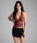 Make a statement in this crop top on a night out. This eye-catching halter features a daring plunge neckline and vibrant abstract pattern that demands attention.