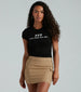 Showcase your good vibes in this graphic crop tee perfect for stepping up your everyday basics! It features short sleeves. a crew neckline. and a front script that reads "In My Lucky Girl Era 777". and is composed of a soft jersey knit fabric. Complete the look with a cute mini skirt and boots for a concert!