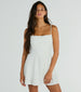 Enter your sweet era with this eyelet lace romper for the ultimate romantic aura at brunch. birthdays. or showers! The flowy and breezy sleeveless rompers feature a flattering cowl neckline with spaghetti straps and an adorable fit and flare silhouette for all-day twirls. Complete the look in wedges.