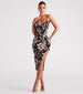 You'll be ready for your paradise getaway with this tropical print midi dress! It features a sleeveless V-neck. spaghetti straps. a sultry cutout back. a bodycon silhouette. and an asymmetrical side slit cutout. Complete the look in wedges.