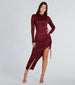 This alluring mock neck high slit midi dress needs to be in your winter lineup! It features a mock neckline. long fitted sleeves. a trendy ruched side seam with an adjustable drawstring. an asymmetric midi-length hem creating a high-cut side slit. and a form-hugging silhouette to flaunt your figure. The brushed knit fabric offers plenty of stretch. Style this midi dress with ankle booties!