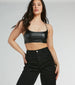 If the moment calls for this faux leather bralette. you must deliver! Perfect for festivals. concerts. and styling under your favorite oversized top or jacket. this bralette features a scoop neckline and adjustable spaghetti straps for a perfect fit and a fitted comfortable hem. Complete the look in an oversized jacket and mini skirt!