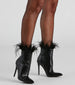 These chic stiletto booties will have you in the mood for drama! They feature a trendy pointed toe. a sleek fitted design. a tall stiletto heel. and a marabou feather trim at the ankle. Style with glitzy rhinestone jewelry.