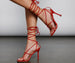 Lace up in heels that get you into that stylish zone. babe! The heels feature an open back. lace-up straps. an open square toe with toe loop. and a sleek stiletto heel. The heels are composed of a faux patent leather material. Complete look with a faux leather mini skirt and crop top.