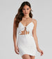 Innocently charming! Bring the flirtiness in this eyelet v-neck dress featuring a sleeveless ruffle trim bodice with tie-front closure. spaghetti straps. a cutout accent. and a form-fitting silhouette. Complete the look in a dainty choker necklace for a day date.