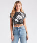News travels fast once you give the inside scoop on where you snagged this newspaper print crop top! It features short sleeves. a crew neck. and a fitted hem with wrap ties on brushed knit fabric. Complete the look in new denim jeans for hanging out with friends!