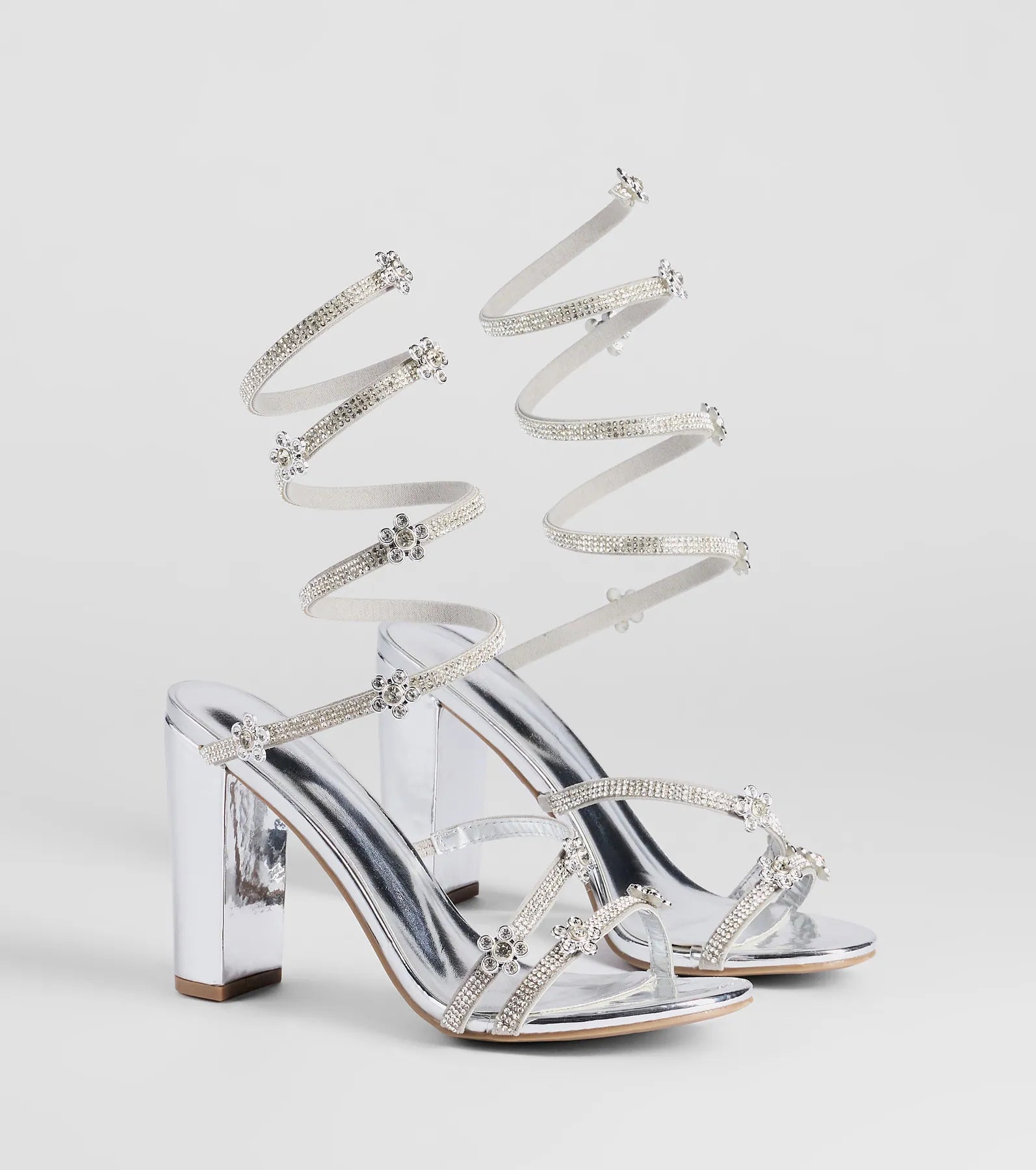 Step out and instantly dazzle in these metallic block heels showcasing a glam rhinestone embellished spiral strap with flower accents. Pair with a clutch.