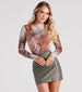 The perfect slay for your cabin in the woods trip! This sheer mesh bodysuit features long sleeves. a mock neck. an abstract print. and a thong bottom with dual snap-button closures. Complete the look in flare faux leather pants.