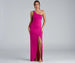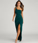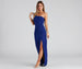 The lovely Iris long formal dress will set the tone for elegance! Captivate any room you walk into! She features a one-shoulder strap design. a padded bust for support. and a curve-hugging wrap skirt with a sexy high slit. The floor-length silhouette elongates your figure on crepe fabric with a moderate stretch. Complete your stunning look in this long dress with dangly earrings and statement heels.