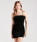 Unlock an irresistible charm in this velvet mini dress for dressy soirees! It features a sleeveless square neckline with diva-chic marabou trim. spaghetti straps. a front ruched seam. and a flattering bodycon silhouette. Complete the look with a sparkly clutch and heels.