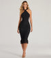 Make an irresistible presence at cocktail parties in this sleeveless midi dress for a chic and bold style! The halter neckline with dual button closures and strappy open back enhance your natural curves while the ruched bodycon silhouette and ruffled midi-length hem create a show-stopping look. Complete the look in stiletto heels and a clutch.