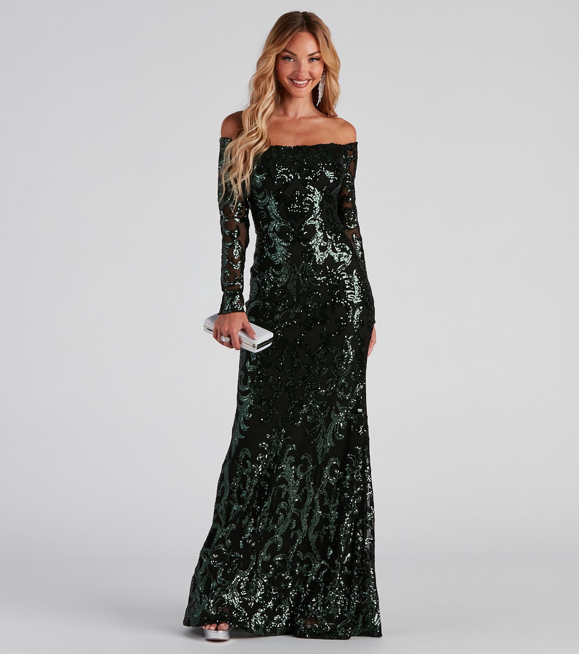 Bring the sparkle with a formal dress that shimmers with each stylish step of your evening! Isador features an off-the-shoulder neckline. elegant long sleeves. and a damask sequin pattern. Her slim-fit waist leads to a flared A-line silhouette to create a twirl-worthy moment! Isador is composed of a lined mesh fabric that offers a form hugging fit with a minimal stretch. Complete look with rhinestone heels and a rhinestone clutch.