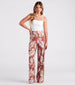 Showcase island vibes on vacation in these must-have tropical pants perfect for chilling under the cabana with a cocktail in hand! They feature a flattering high-rise waist. slim hip-hugging fit. a wide-leg silhouette. and a breezy palm print. Complete the look in platform sandals.