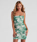 Look like you're ready to jet-set off to an island retreat in this mesh mini dress! It features a sleeveless square neckline. spaghetti straps. ruched detailing down the side seams. and a short. curve-hugging fit. The lined mesh fabric features an all-over tropical palm leaf print. Complete your look with espadrille wedges.