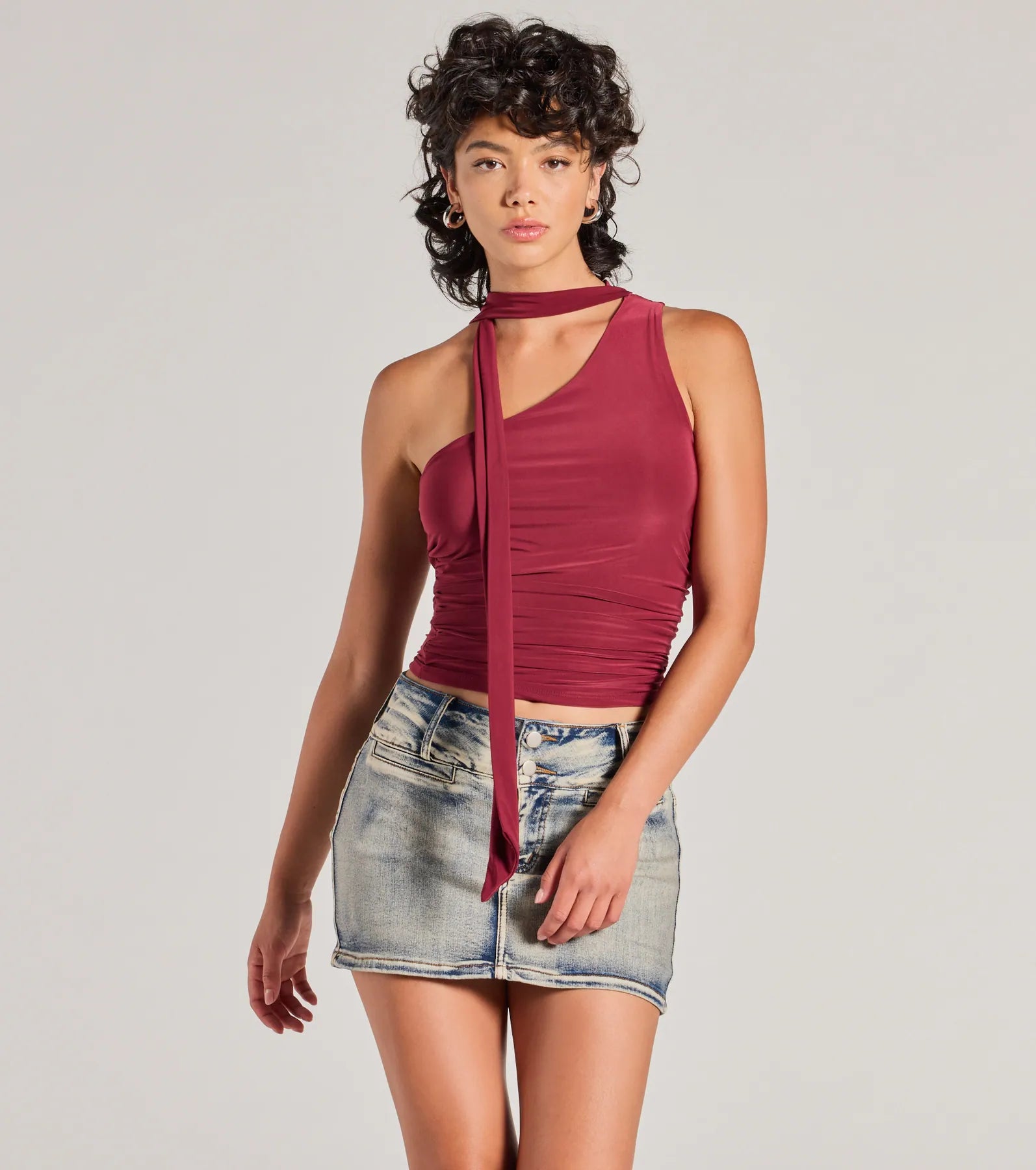 Chic and so on-trend. this stretchy knit top features an asymmetric one-shoulder neckline with an attached neck tie for that it-girl vibe. The front ruching will accentuate your curves on the fitted midi-length silhouette.