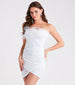 Captivate the crowd in the Izzey sequin party dress perfect for brides or birthday girls! She shines in a strapless neckline adorned with feather trim and non-slip grip lining. a bodycon silhouette. and a faux wrap mini-length hem. The party dress is composed of a sequin-knit velvet fabric with a stretchy knit lining. Complete the look in luxe earrings and heels for an unforgettable style!