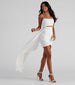 Make a dramatic entrance with a formal dress that is perfect for those after-parties or reception! Jaelyn features a sleeveless square neckline. spaghetti straps. a sexy cutout at the midriff. a ruffled draped accent at the waist. and a short-length wrap hem. The dress is composed of a lined crepe fabric that offers a form hugging fit with built-in retention and a moderate stretch. Complete your formal outfit with rhinestone heels and a rhinestone choker.