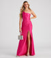 Stunning for bridesmaids and upcoming holiday soirees. the Jailene formal dress delivers a sleek silhouette with sultry detail! She features a sleeveless one-shoulder neckline. a tank-style strap. center front ruched seam atop her sexy high-cut slit leading to her floor-length hem. The formal dress is composed of a light shiny knit fabric with a moderate stretch. Complete your dressy look with a rhinestone bracelet and clutch.