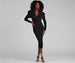 Show some curves in the Jaimie Formal Surplice Wrap Tea Length Dress designed to flaunt your hourglass in a form-fitting silhouette. She features puff long sleeves. a surplice v-neckline on a fitted bodice. side ruched seams. and a wrap-style skirt. Composed of sleek knit fabric that offers plenty of stretch. Finish your look in rhinestone hoops and a clutch.