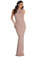 Create your own fairytale tonight in our gorgeous Janelle dress! She is a natural tone. floor length formal dress that features a high round neckline. a sleeveless bodice. and a stunning plunging cowl back with a large bow detail. Her soft. glitter adorned. knit fabric features a form hugging fit with plenty of stretch. Glitter may transfer.