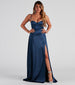 Make a grand entrance in a formal dress that radiates elegance! Jaxine features a sleeveless sweetheart neckline with adjustable spaghetti straps and a corset bodice with piping accents. Her slim-fit bodice leads to a sweeping A-line silhouette with a daring high side slit. She is composed of a smooth satin fabric that offers a relaxed fit with minimal stretch. Complete look with rhinestone heels.