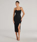 The Jayleen ruched mesh midi dress is designed with a sleeveless sweetheart neckline with a built-in padded bust accented with a draped cowl neck overlay for a chic look. The corset-style bodice features flexible boning to provide structure and a high waist seam for a snatched fit. while the bodycon silhouette is detailed with a ruched high-front slit for an alluring vibe.