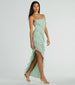 Have a stunning essence in the Jaymie one-shoulder ruffle slit formal dress as a bridesmaid or wedding guest! Elevate your evening attire with this exclusive piece boasting a one-shoulder neckline with an adjustable spaghetti strap. a slim silhouette. and a high side slit. this dress will accentuate your silhouette. The delicate ruffle trim throughout and the long hem add a touch of femininity. while the mesh fabric adds a touch of allure. Complete the look in mules and earrings!