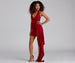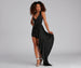 Add drama to the evening in the Jaymie Satin Halter Side Drape Short dress perfect for all-night dancing! Captivate in her sleeveless halter bodice with a sultry keyhole neckline atop the pleated empire waist. She features a side ruched faux wrap skirt that flaunts your figure alongside the eye-catching ruffled drape. Composed of sleek satin-knit fabric with plenty of stretch. Perfect for styling with rhinestone hoops and sparkly heels.