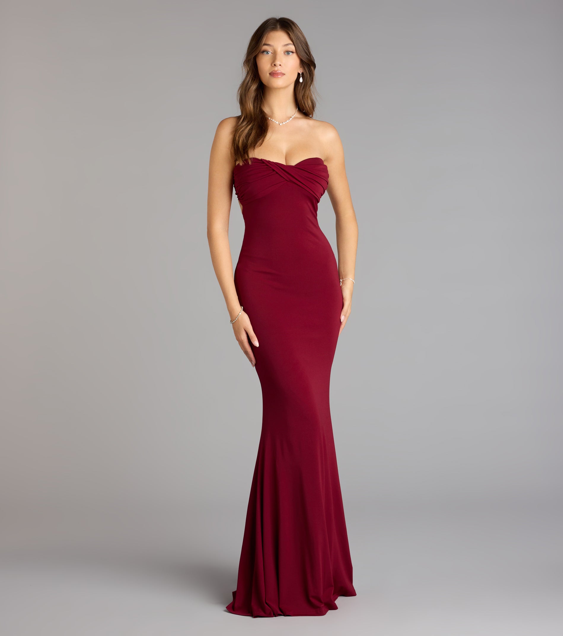 Elegance in motion—the Jessica strapless mermaid gown hugs every curve with sleek sophistication. featuring a ruched sweetheart bodice and an open back cutout that feels equal parts timeless and daring.