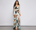 Make a striking impression in a formal dress that is a true one of a kind! The dress features a sleeveless cowl neckline with subtle pleating. adjustable spaghetti straps. a watercolor-inspired print. and a high side slit. The dress is composed of a satin fabric that offers a form hugging fit with minimal stretch. Complete look with rhinestone sandals.
